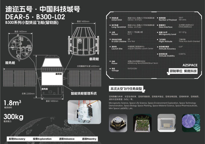 “迪迩五号”为紫微科技研制的袖珍货运飞船留轨版(B300-L),选拔双舱串联构型,放射情景由下至上循序是处事舱和载荷舱。该飞船载货空间1.8立方米,载货智商跳跃300千克,能源供给智商为长久600瓦、峰值1000瓦,因循300Mbps(37.5MB/s)的下传速度。飞船配备智能货舱惩处系统,可在轨惩处跳跃100个载荷。
